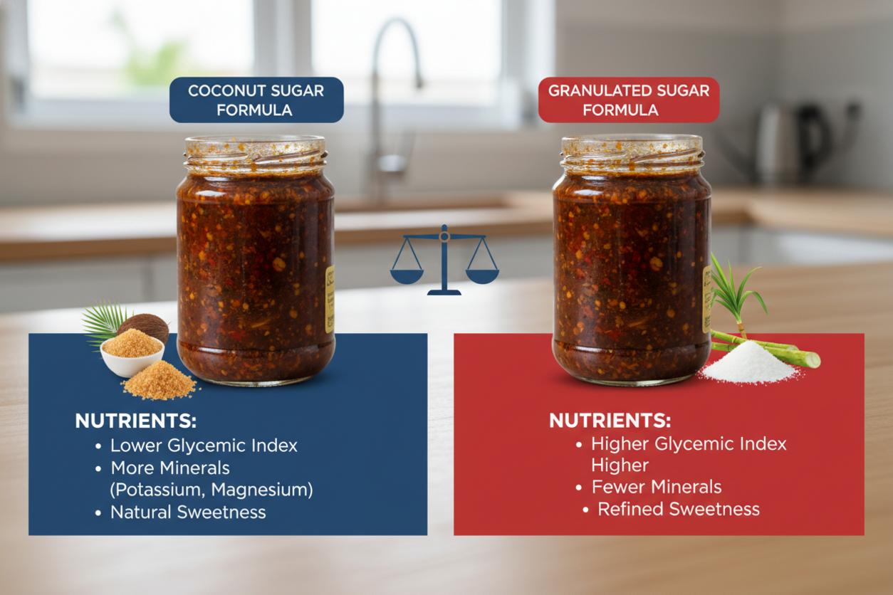 การเปลี่ยนจากการใช้น้ำตาลทรายมาเป็นน้ำตาลมะพร้าวในสูตรน้ำพริก สามารถเพิ่มความหอมหวานและความกลมกล่อมที่ลงตัวให้กับเมนูนี้ได้อย่างชัดเจน น้ำตาลมะพร้าวไม่เพียงแต่ให้รสชาติหวานที่ธรรมชาติ แต่ยังมีประโยชน์ด้านสุขภาพที่ดีกว่าน้ำตาลทราย ทั้งลดความเสี่ยงจากการบริโภคน้ำตาลมากเกินไปและเพิ่มปริมาณสารอาหารที่ดีต่อร่างกาย