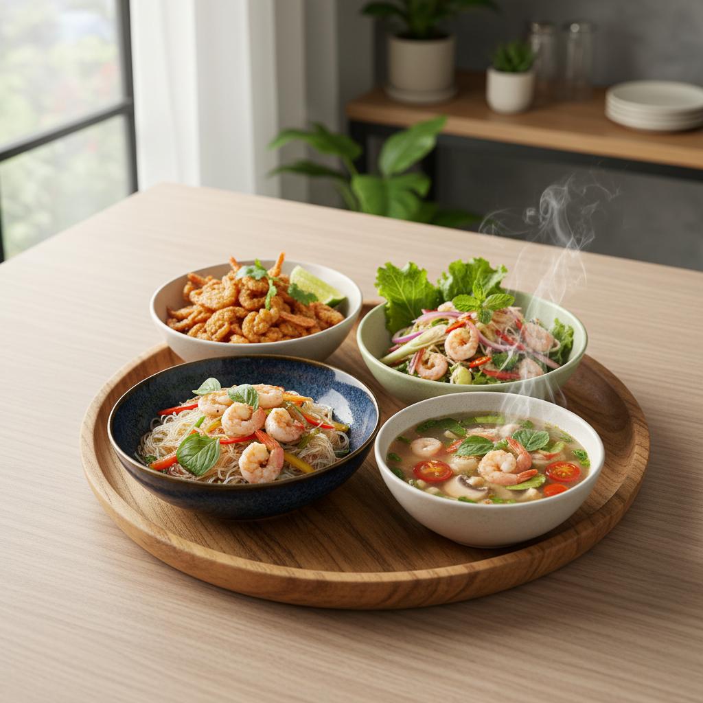 2. **ยำกุ้งฝอย**: เมนูสำหรับคนรักรสเปรี้ยวแซ่บ เริ่มต้นด้วยการลวกกุ้งฝอยจนสุก ปรุงน้ำยำจากน้ำปลา น้ำมะนาว น้ำตาล และพริก จากนั้นคลุกเคล้ากับหอมแดงซอย ผักชีฝรั่ง และผักสดตามใจชอบ รสชาติหอมและสดชื่นด้วยสมุนไพรไทย